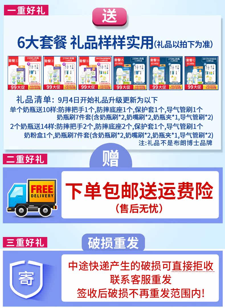 破损重发:限快递中途破损产生,签收后人为自己摔碎,不在赔付范围内.请息知!(套餐送的礼品 均不是布朗博士品牌)