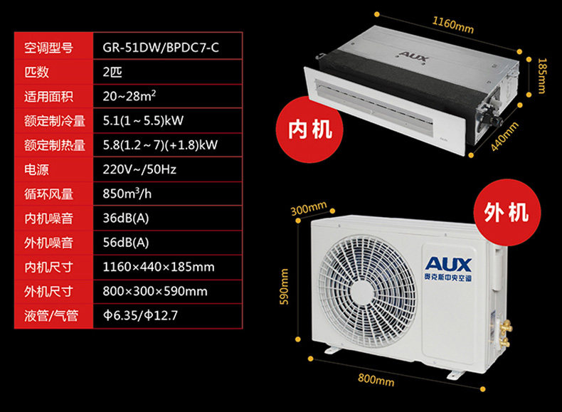 AUX/奥克斯 一拖一2匹变频风管机家用中央空调 GR-51DW/BPDC7-C