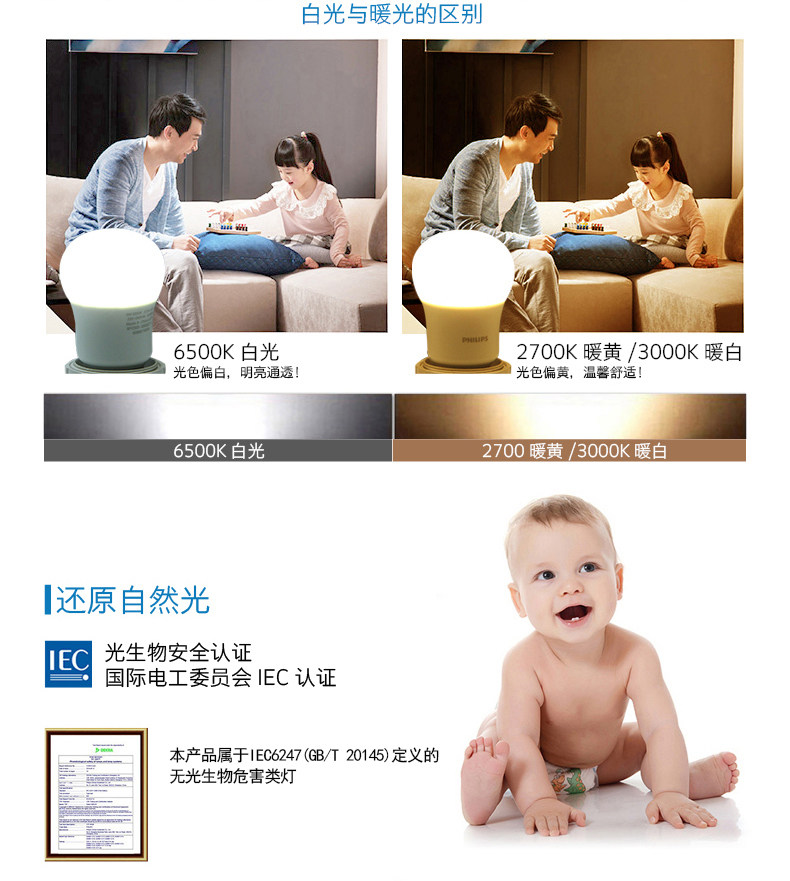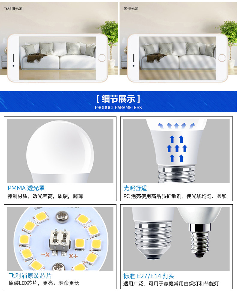 飞利浦E27大螺口5W四只装led灯泡 暖白黄节能照明光源lamp单灯