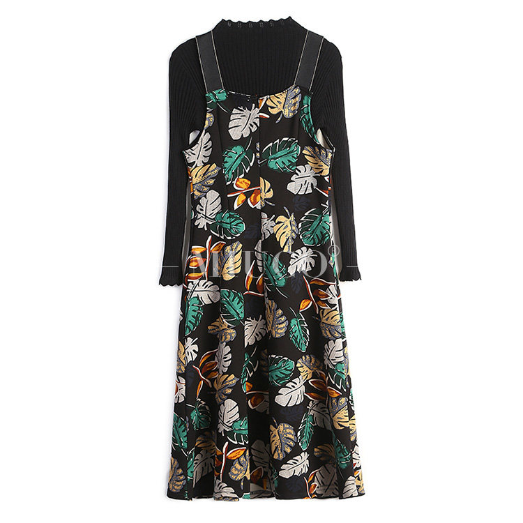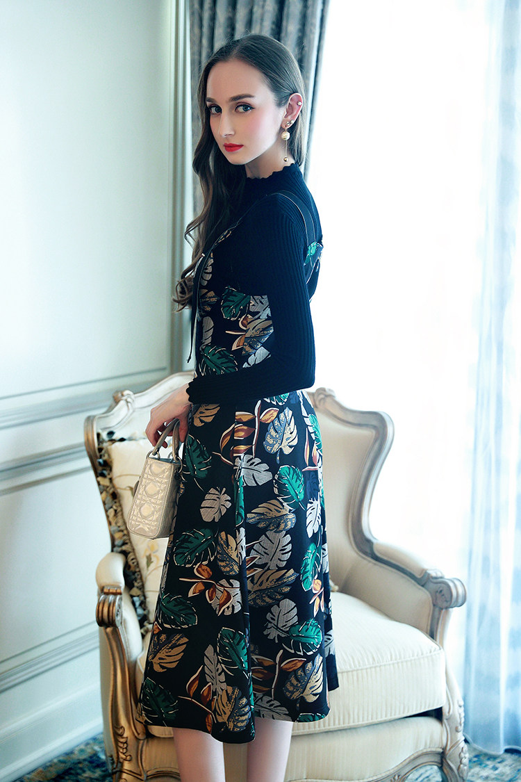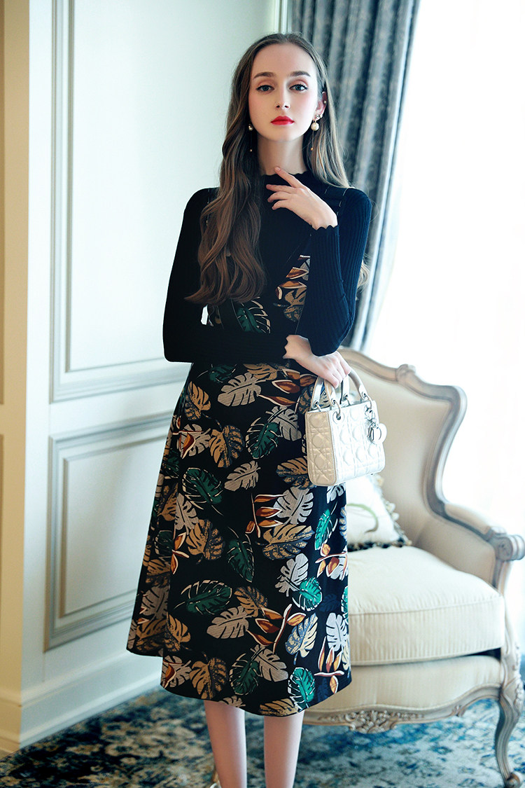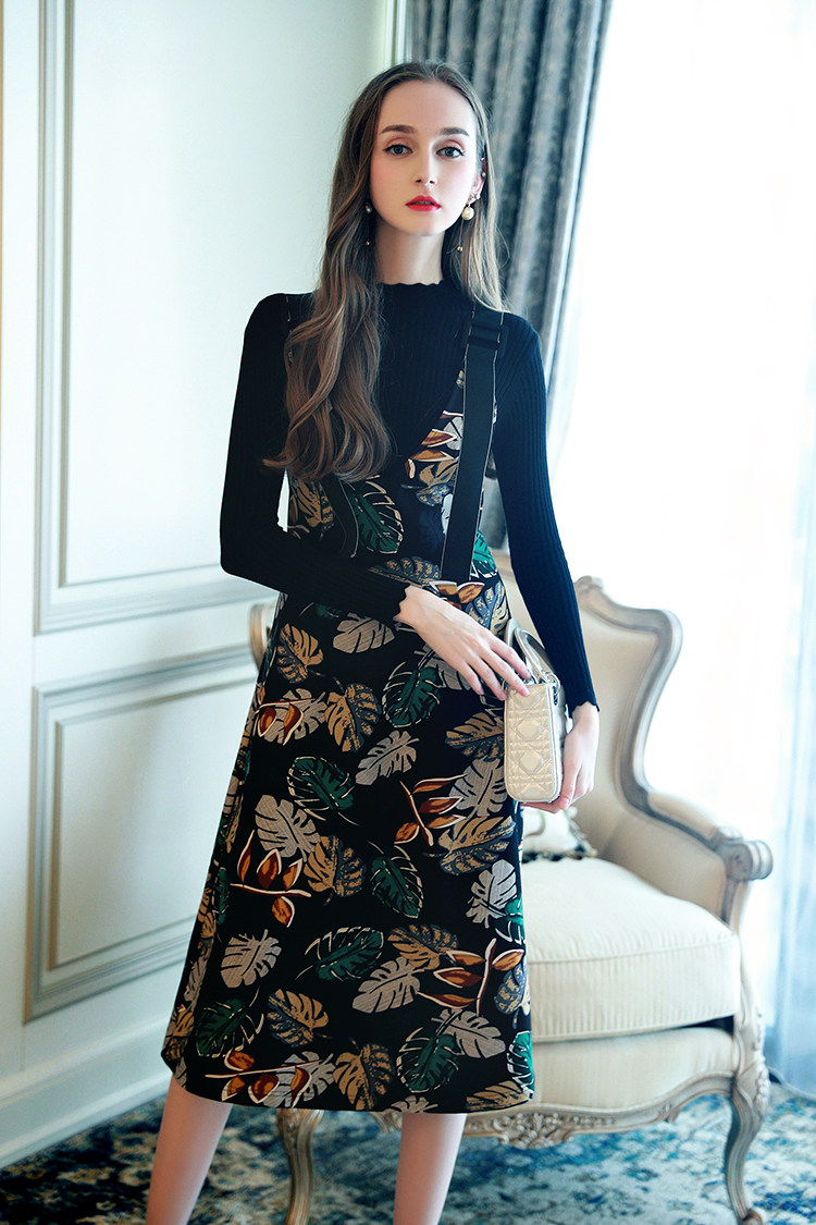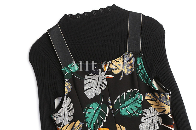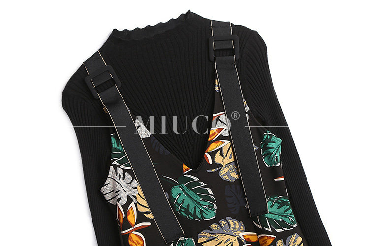 miuco女装2017秋季新品波浪花边修身针织衫+印花背带连衣裙两件套