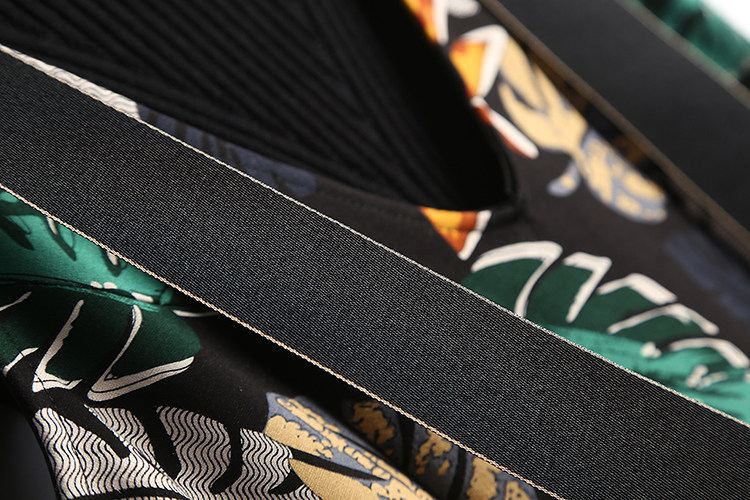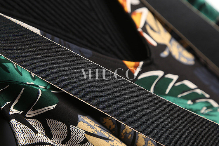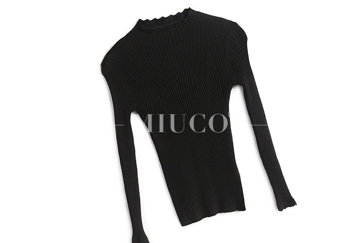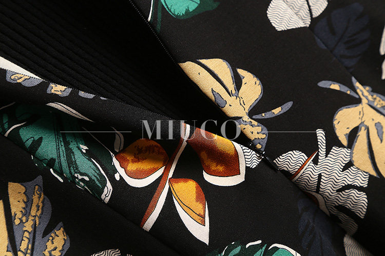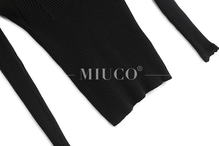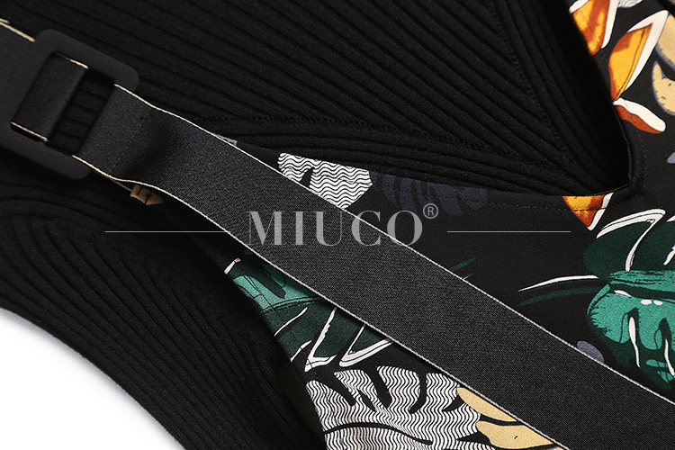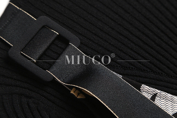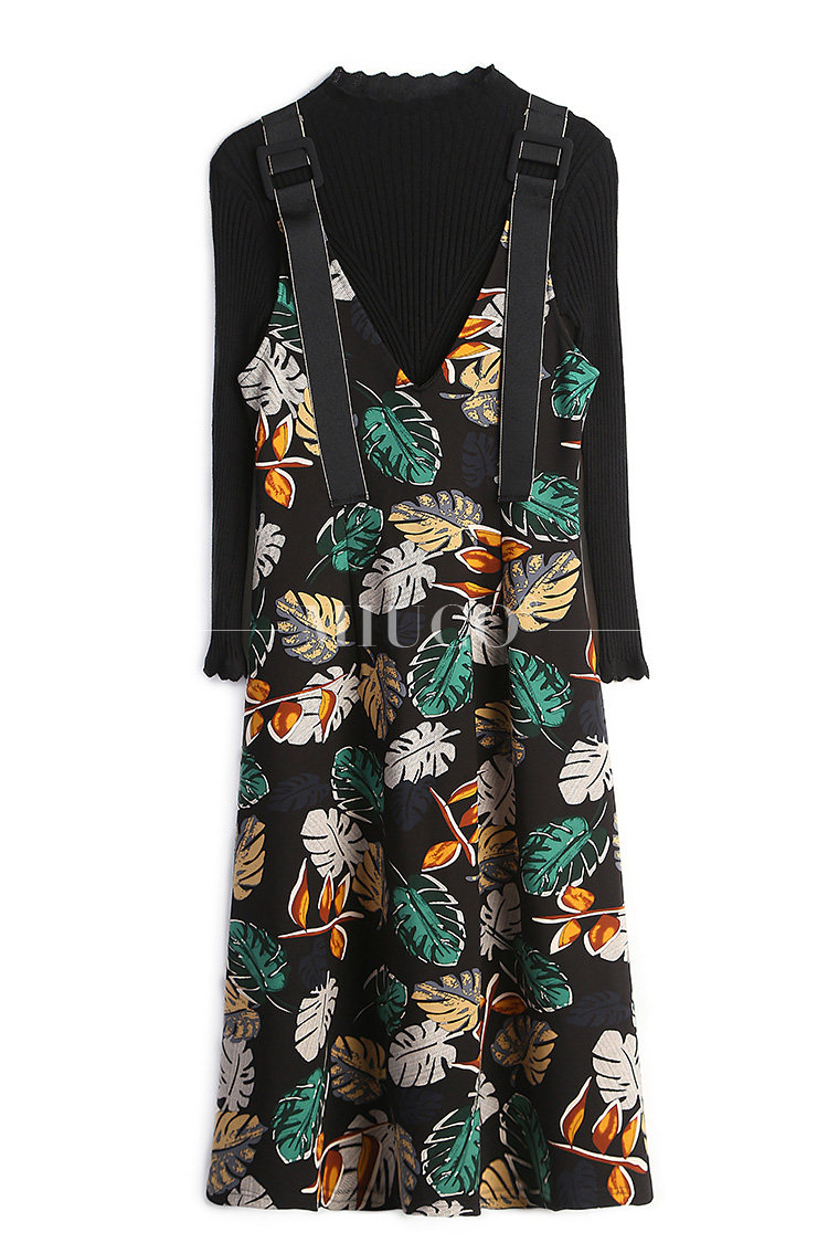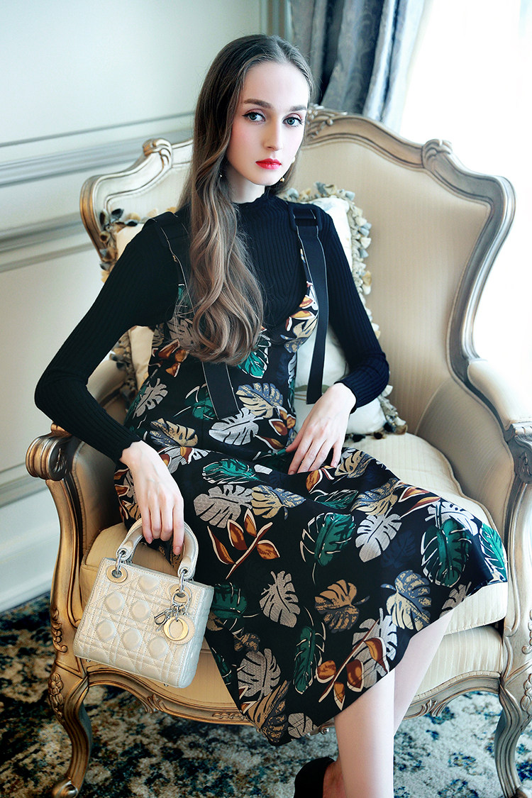 miuco女装2017秋季新品波浪花边修身针织衫+印花背带连衣裙两件套