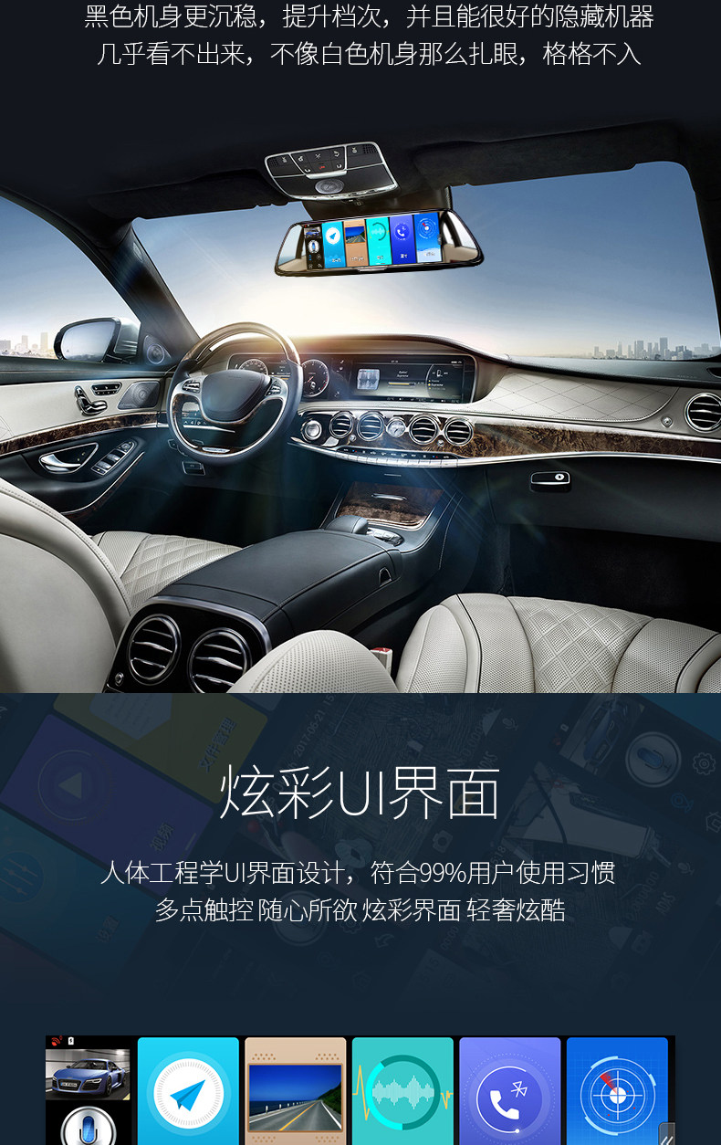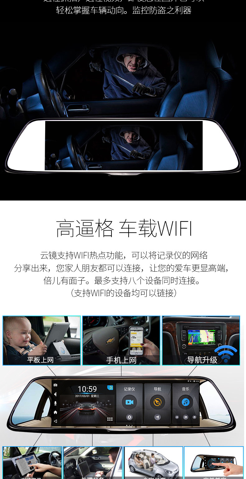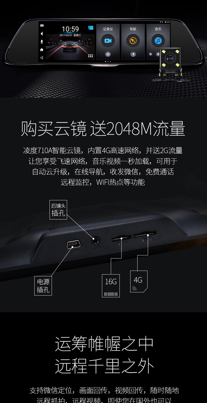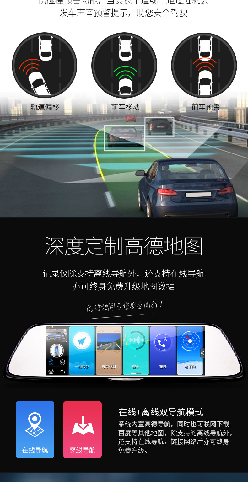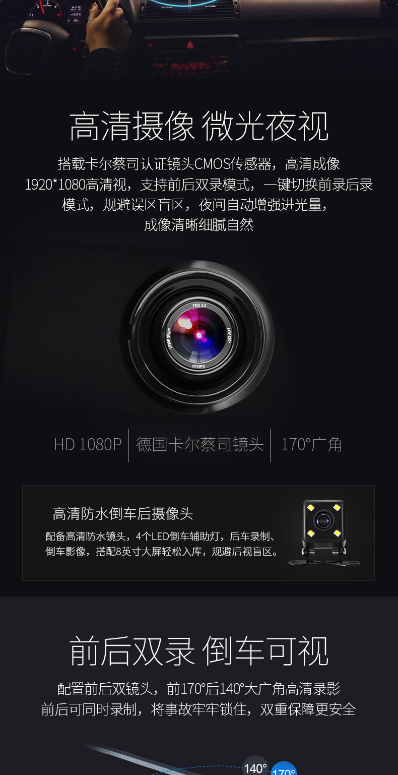 功能: 循环录像 微信查车,智能声控,微信接人,违章查询,FM发射, 移动侦测 GPS定位 GPS导航 WIFI 上网 倒车影像 停车监控 前车碰撞预警 前车车距侦测 固定测速 流动测速 碰撞感应 轨道偏移预警 前后录像 前后双镜头 智能声控,微信接人,FM发射